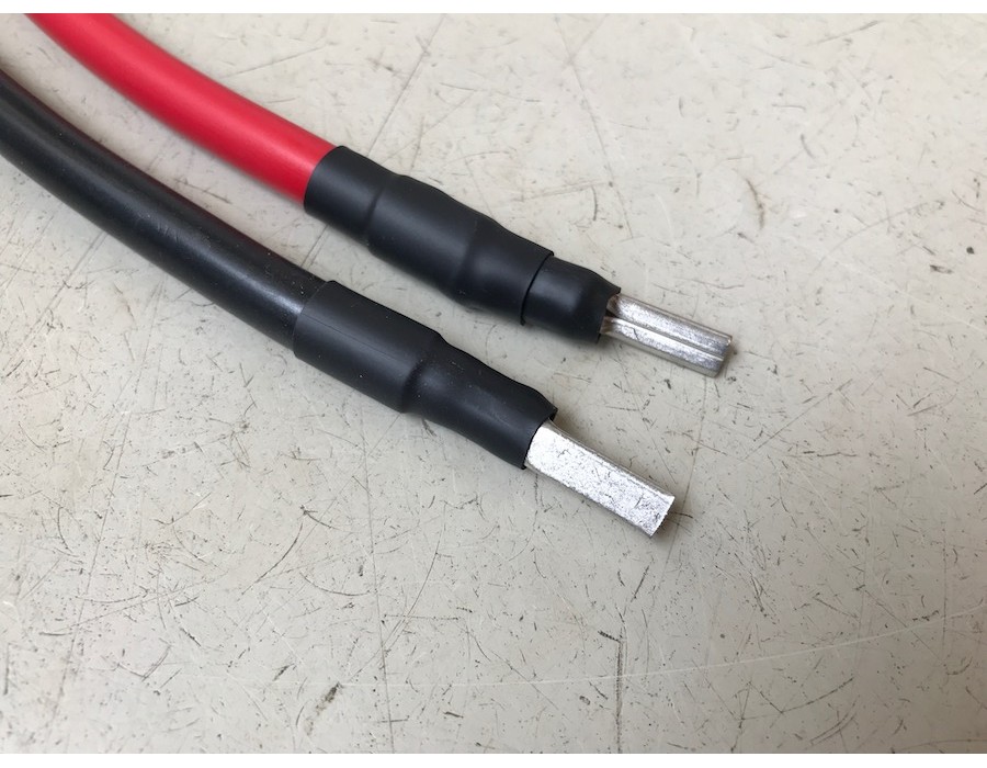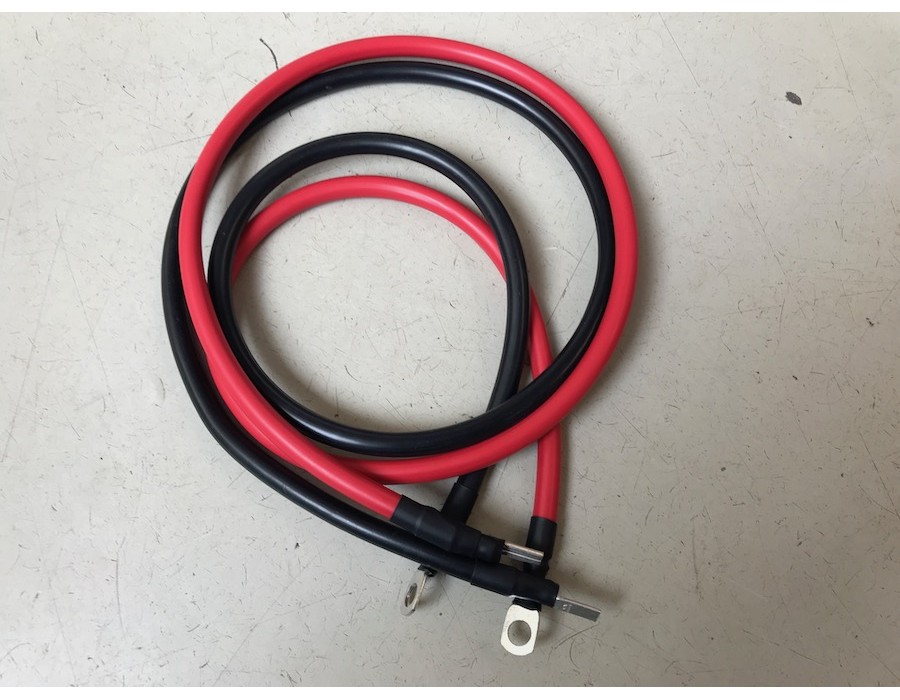 2 stuks kabel met aan één zijde een accu-oog en aan de andere kant een pin (stift), voor insteken in omvormers die werken met pin-gat verbinding. Lengte per kabel 1 meter. Koperoppervlak van de kabels is 16mm2. Diameter (dikte) is ongeveer 0,9 cm. De pin heeft een breedte van 5 mm en een dikte van 2 mm, en is 15 mm lang. De accu-ogen zijn M6, M8 of M10, uw keuze dient u voor het bestellen op te geven.