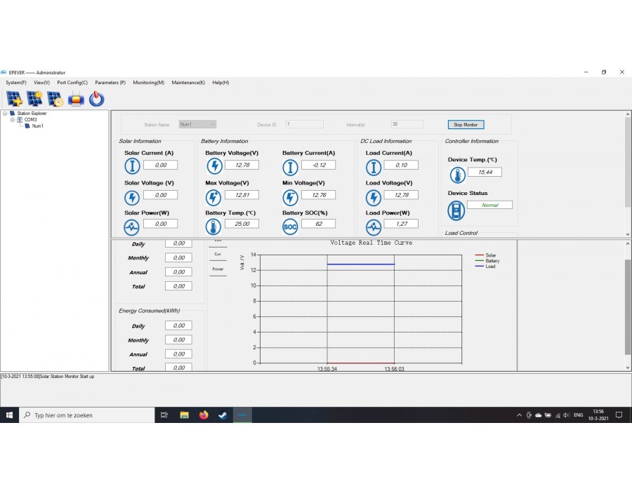 Uit onze eigen ervaring: de software maakt een softwaredriver aan voor een zogenaamde com-poort. Deze compoort vindt u terug in het Apparaatbeheer van Windows. Het is noodzakelijk om in 'eigenschappen/properties' van het apparaat een vinkje te zetten bij RS-485. Daarna kan het hoofdprogramma worden gestart en de juiste com-poort worden geselecteerd. Nadat u een vinkje heeft gezet bij 'start monitoring' moet er data uit de laadregelaar zichtbaar worden op uw computerscherm.