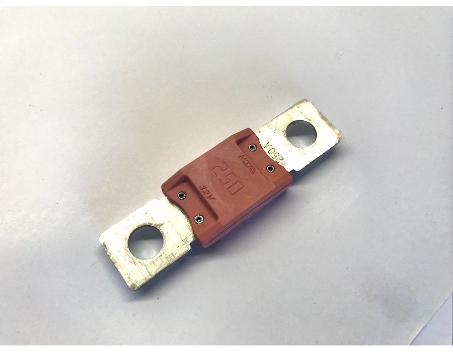 250 ampère hooglast zekering met vertinde gat aansluitingen. Voor 2500-3000 watt omvormers. Zekeringselement is aan één zijde zichtbaar in behuizing. De hooglast zekering kan worden geplaatst in onze Zekeringhouder voor Mega Zekering.