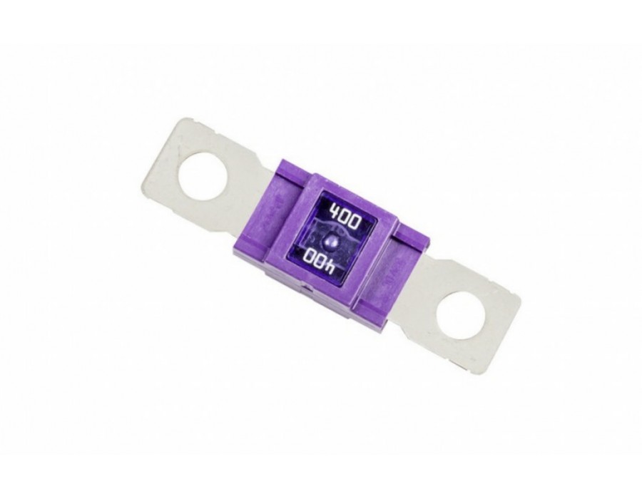 400 ampère hooglast zekering met vertinde gat aansluitingen. Zekeringselement is aan één zijde zichtbaar in behuizing. De hooglast zekering kan worden geplaatst in onze Zekeringhouder voor Mega Zekering.