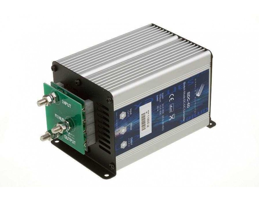 Efficiënte 24 naar 12 volt omvormer. Zeer stabiel en lage stoorspanning, dus ideaal voor bijvoorbeeld audio- en videotoepassingen. Maximale stroom die continu kan worden geleverd is 60 ampère (720 watt).